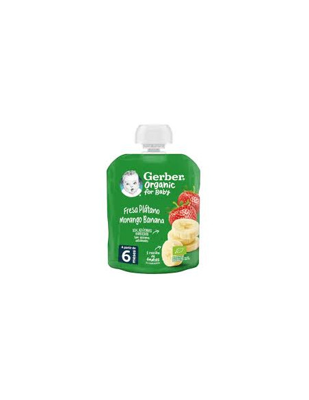Bolsita de puré de fruta ecológica para bebé GERBER Fresa Plátano es una perfecta combinación de frutas 100% ecológicas para tu bebé.