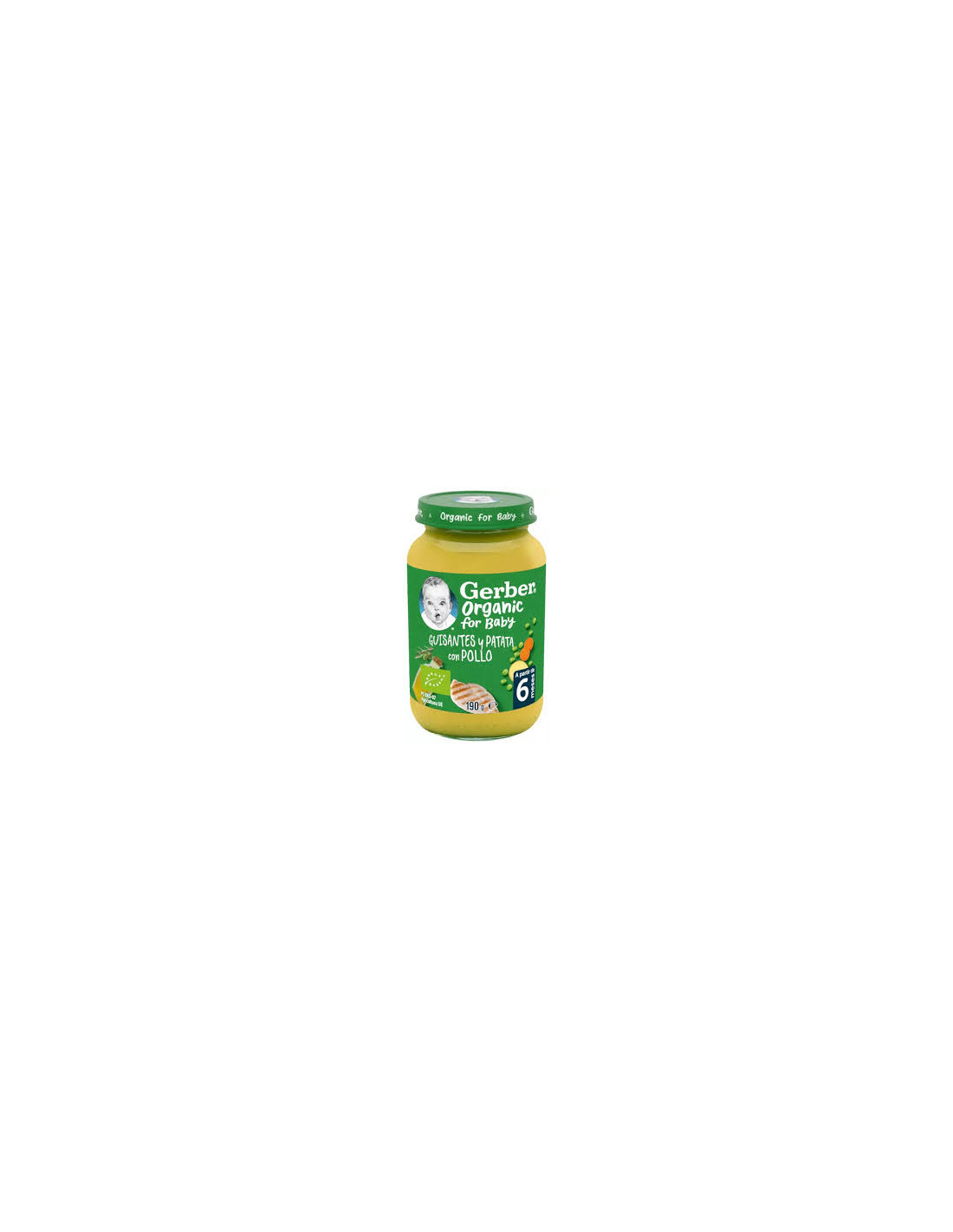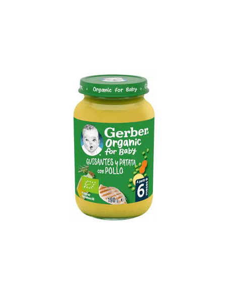 El tarrito de puré para bebé GERBER Guisantes, Patata y Pollo está elaborado con ingredientes 100% orgánicos de primera calidad, respetando el medioambiente.