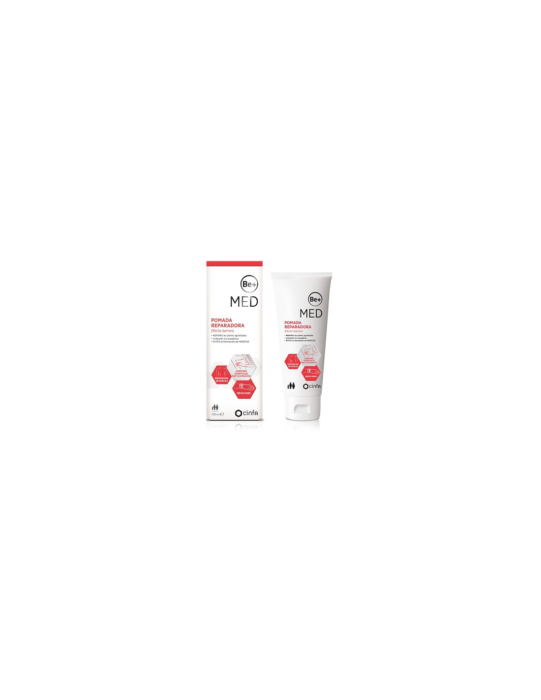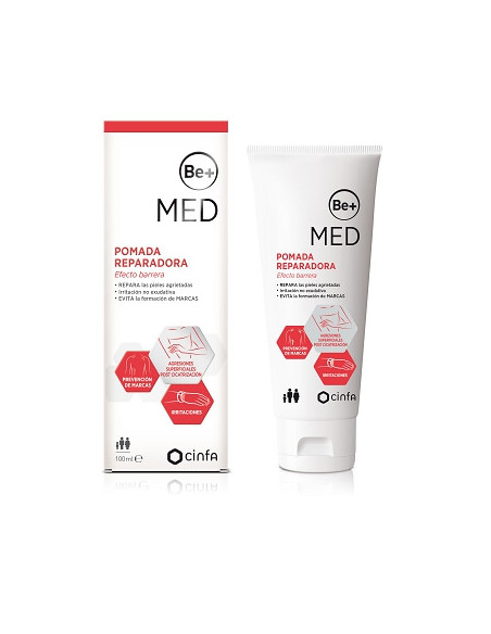 Be+ MED Pomada Reparadora Efecto Barrera: es un producto sanitario indicado para favorecer la cicatrización en caso de lesiones cutáneas no exudativas propensas a sufrir infecciones y dejar marcas en la piel. Forma una barrera tópica que evita la pérdida de agua y protege la lesión frente agentes contaminantes.