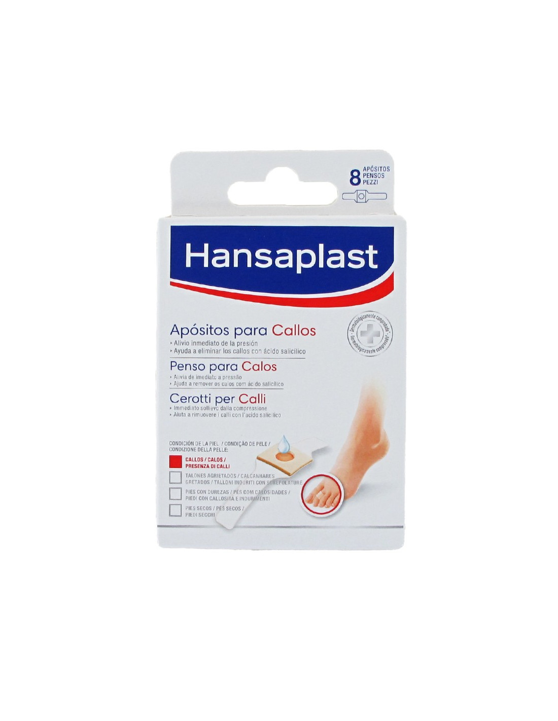 El Apósito para Callos de Hansaplast ablanda los callos gracias a su ingrediente activo, el ácido salicílico. Este ingrediente, situado en el centro del anillo de espuma, actúa ablandando la estructura que sujeta las células del callo. La piel callosa y la sustancia intercelular que mantiene unidas sus capas se ablandan lo que da lugar a un aumento de la hidratación de la zona.