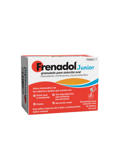 Frenadol® Junior se indica para favorecer el alivio sintomático de gripes y catarros con dolor de cabeza leve o moderado, además de fiebre, tos improductiva, como la tos irritativa y la nerviosa, y secreción nasal en niños de más de 6 años y adolescentes.